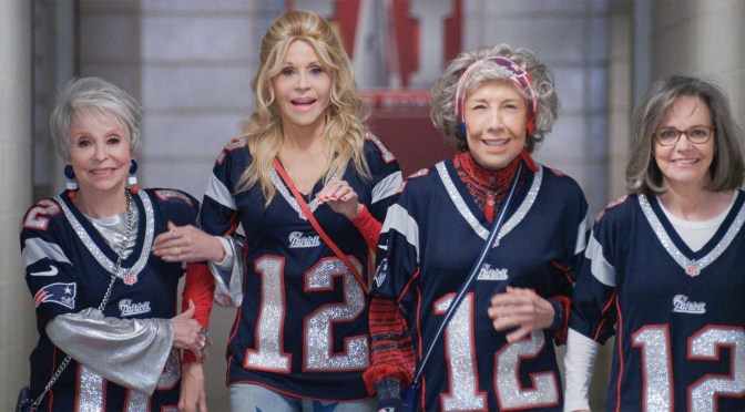 Such foibles are essential in a film reliant on left turns to prevent the conclusion landing within around twenty minutes. For better or worse, the narrative really is that simple. While undergoing chemotherapy some sixteen years prior to the film’s events, sparky sexagenarian Lou (Lily Tomlin) stumbles across the National Football League. The obsession is instant, not least due to the ‘beautiful’ masculinity of quarterback Tom Brady. Fast forward to 2017 and Lou’s obsessed. She’s not alone in the addiction. Jane Fonda, Rita Moreno and Sally Field play best friends Trish, Maura and Betty, a trio easily summed by their given stereotypes: the flirt, the widow and the held-back housewife with a brilliant brain. When opportunity knocks for the gang to attend that year’s Super Bowl, they’re quick to answer.